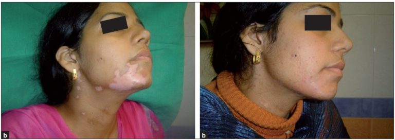 Melanocyte cell transplantation is very effective in the treatment of stable, non-progressive vitiligo, the main advantage being that large areas can be treated; with a small donor site with just 8–10 cm2 of the donor area, a 100 cm2 area of the vitiligo patch can be treated. Repigmentation occurs in most cases within 2–4 months; repigmentation is uniform and matches well with the surrounding skin [Figures [Figures6a6a–b]. All sites including eyelids, fingers, lips and joints (excluding palms and soles) can be treated.