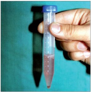The epidermis was further broken into smaller pieces in a Petri dish and washed with the DMEM / F-12 medium and finally transferred to a test tube containing the DMEM / F-12 and centrifuged for 6 min. The supernatant was discarded and the pellet was suspended in a test tube [Figure 1]. The final volume prepared varied from 0.2 to 0.5 ml depending on the size of the area to be treated.