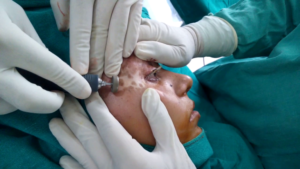 The recipient site is abraded with a dermabrader fitted with a diamond fraise wheel (Delasco™). While operating close to the eyelid margins, an erbium:YAG (Er:YAG) laser is used with a fluence of 1,000 mJ, 1–2 passes. The endpoint of ablation is pinpoint bleeding. Hemostasis is achieved and the ablated area is covered with saline-soaked gauze pieces.